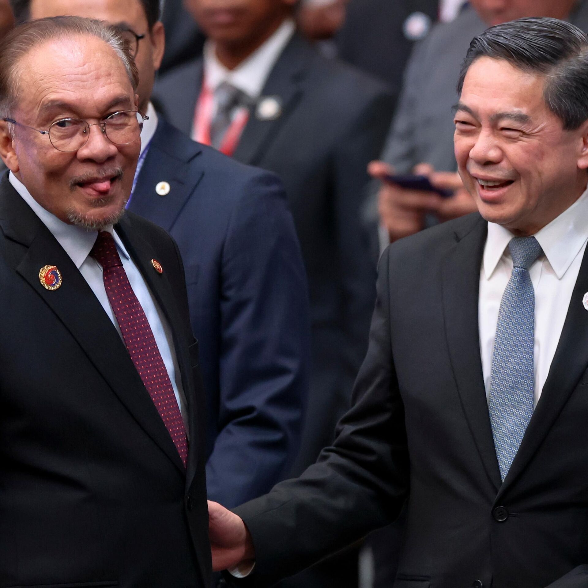2025 оны 10-р сарын 27-ны Даваа гарагт Малайзын Куала Лумпур хотод болсон Зүүн Өмнөд Азийн Үндэстнүүдийн Холбооны (АСЕАН) 47 дахь дээд хэмжээний уулзалтад оролцохоор Куала Лумпурын Хуралдааны Төвд хүрэлцэн ирсэн Малайзын Ерөнхий сайд Анвар Ибрагимтай зүүн талд гар барьж байна. (Лиллиан Суванрумфа/Pool Photo via AP)