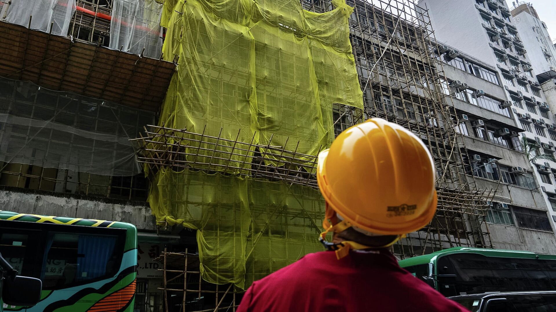 2025 оны 12-р сарын 4-ний Пүрэв гарагт Хонконгийн Шинэ нутаг дэвсгэрийн Тай По дүүргийн Ван Фук шүүхэд гарсан галын дараа Монг Кок дүүрэгт засвар хийгдэж буй барилгын ойролцоо барилгын ажилчин зогсож байна. (AP Photo/Chan Long Hei)