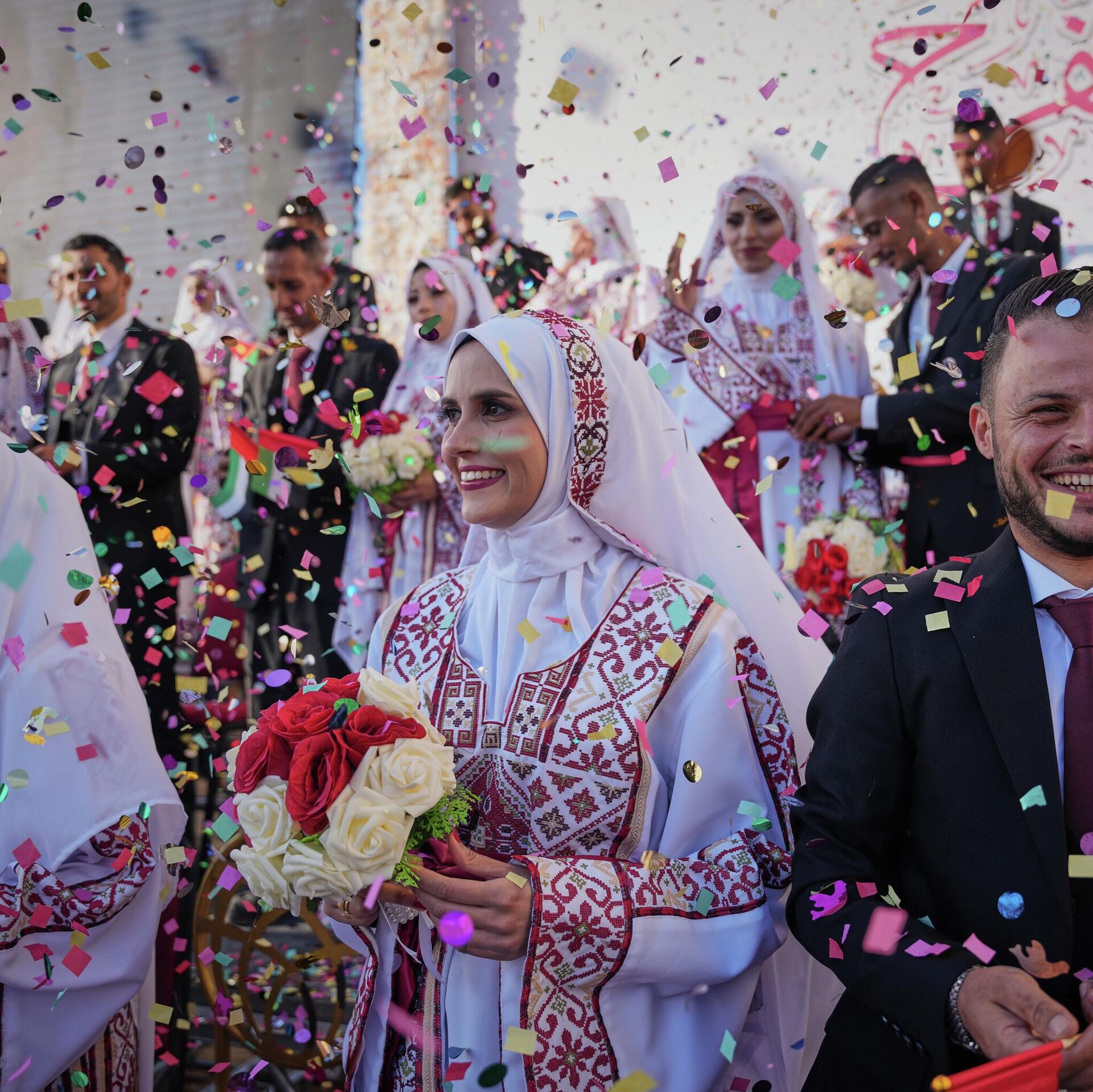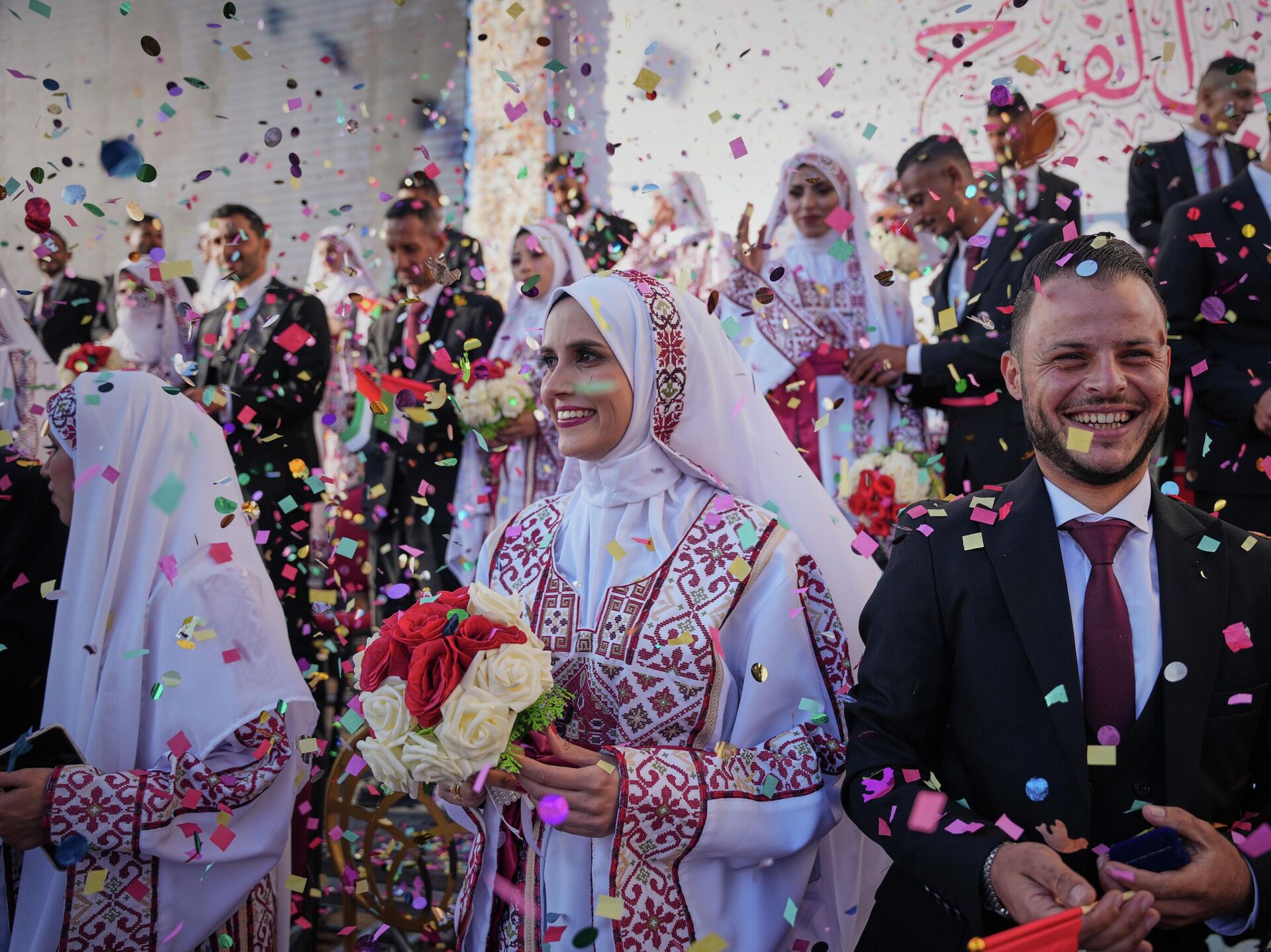 2025 оны 12-р сарын 2-ны Мягмар гарагт Газын зурвасын Хан Юнис хотын Хамад хотод болсон олон нийтийн хуримын ёслолд Палестины хосууд оролцож байна. (AP Photo/Абдел Карим Хана)