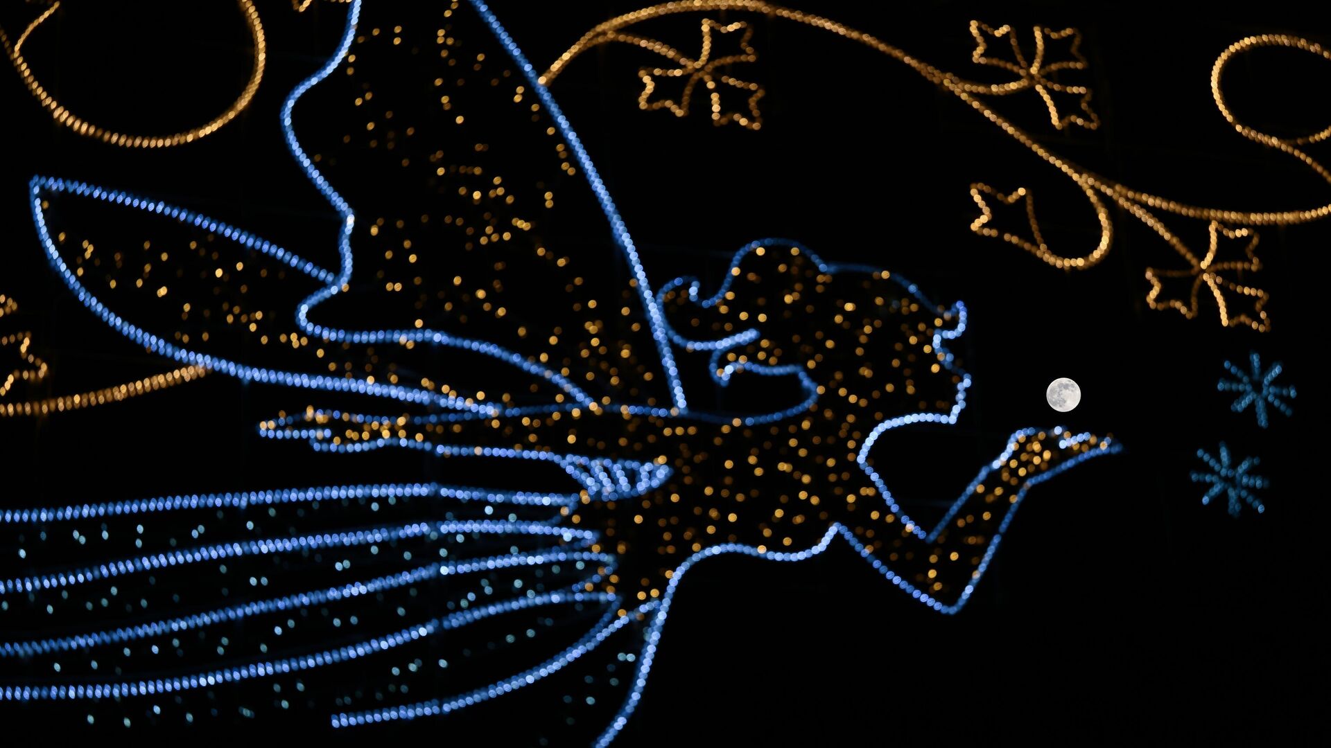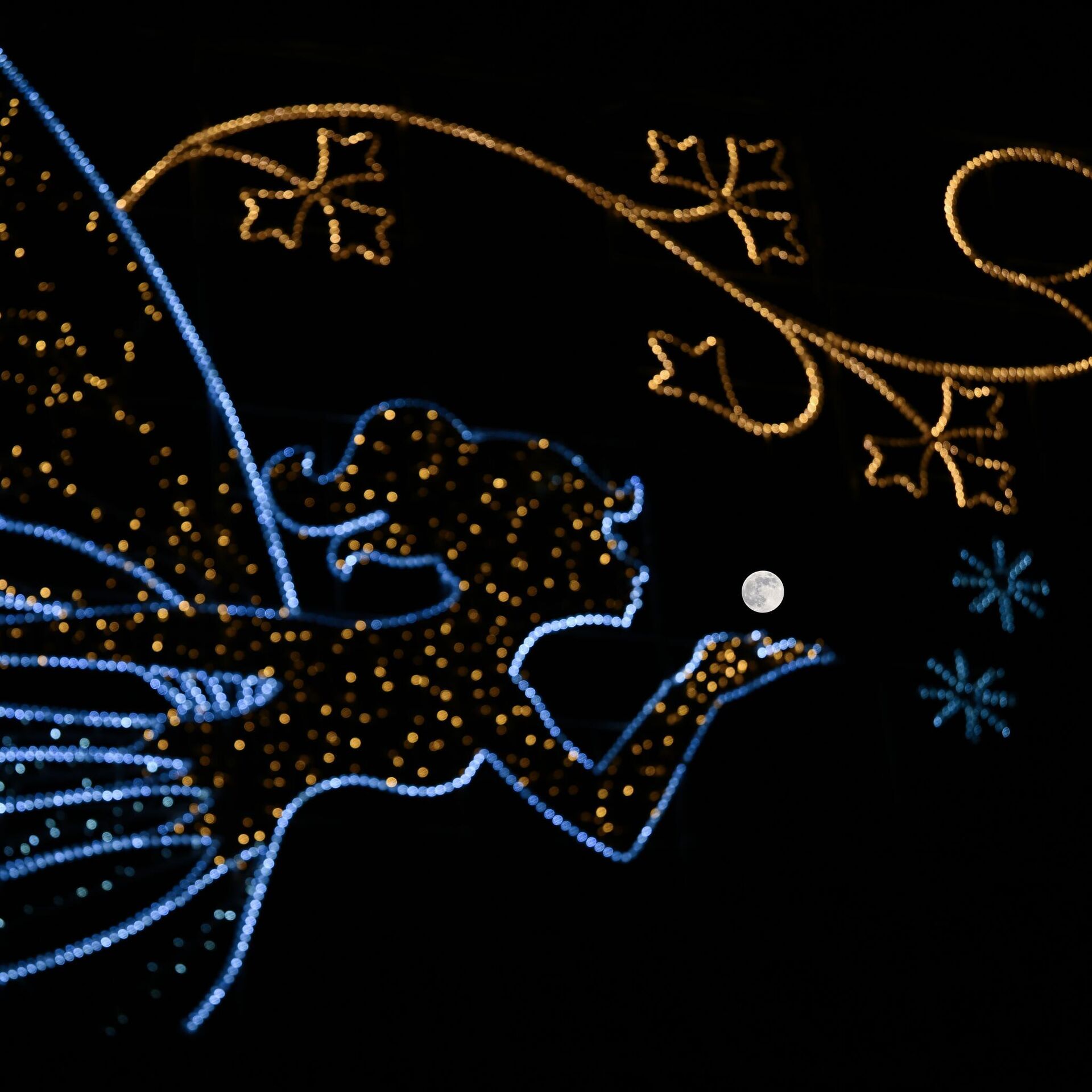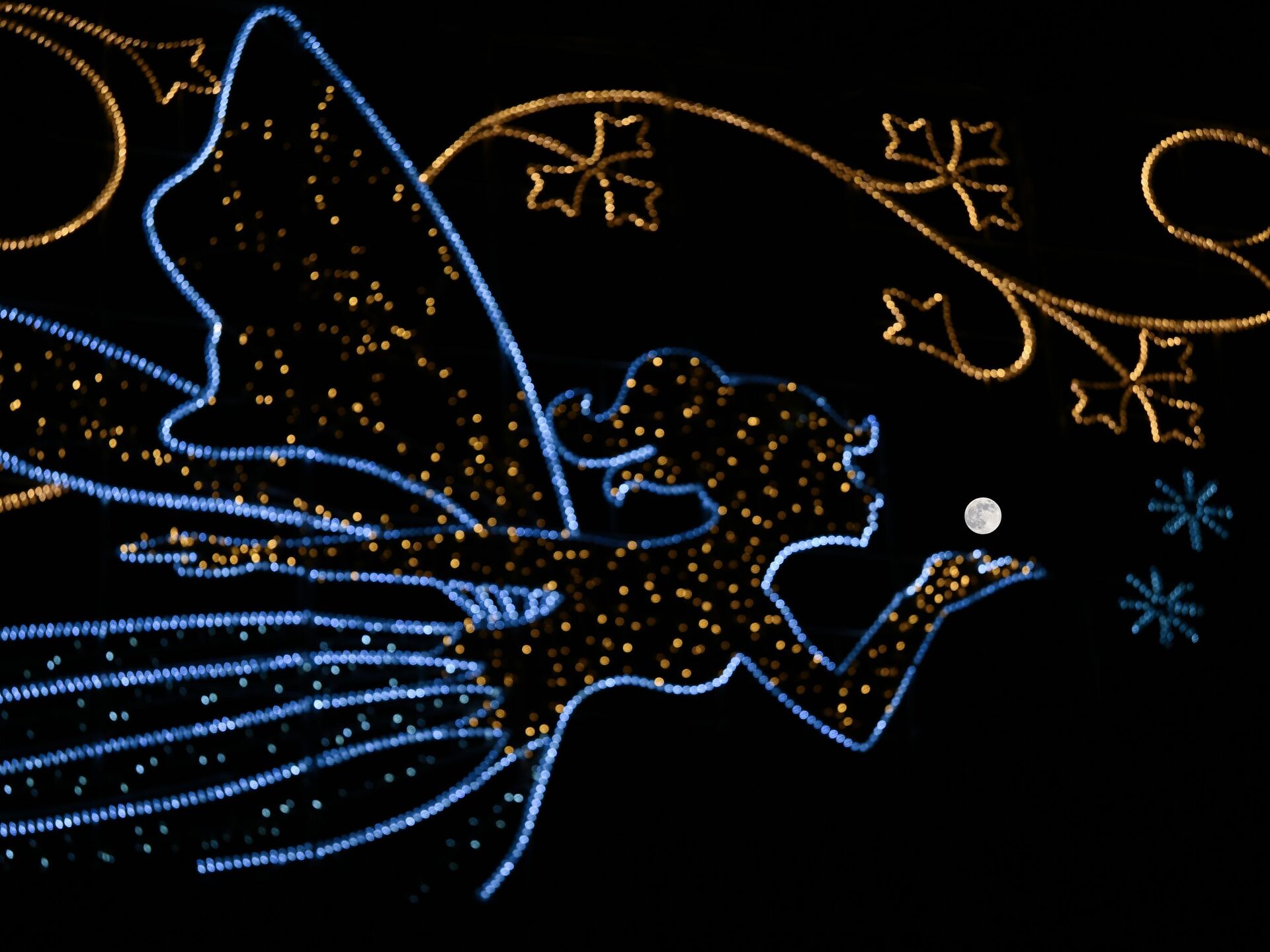 ЛОНДОН, ИХ БРИТАНИ - 12-Р САРЫН 4: 2025 оны 12-р сарын 4-нд Их Британийн Лондон хотод тэнгэрт сар руу үлээж буй дагина хэлбэртэй хотын гэрлийн ард бүтэн сар гарч ирэв. (Зургийг Расид Некати Аслим/Anadolu via Getty Images)